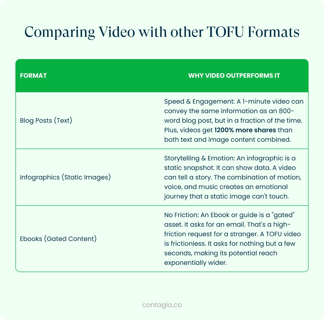 When you apply this science of attention, it becomes clear why video has such a massive edge at the top of the funnel. Let's compare it directly to other popular TOFU formats.